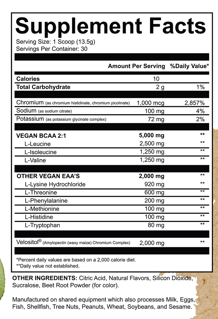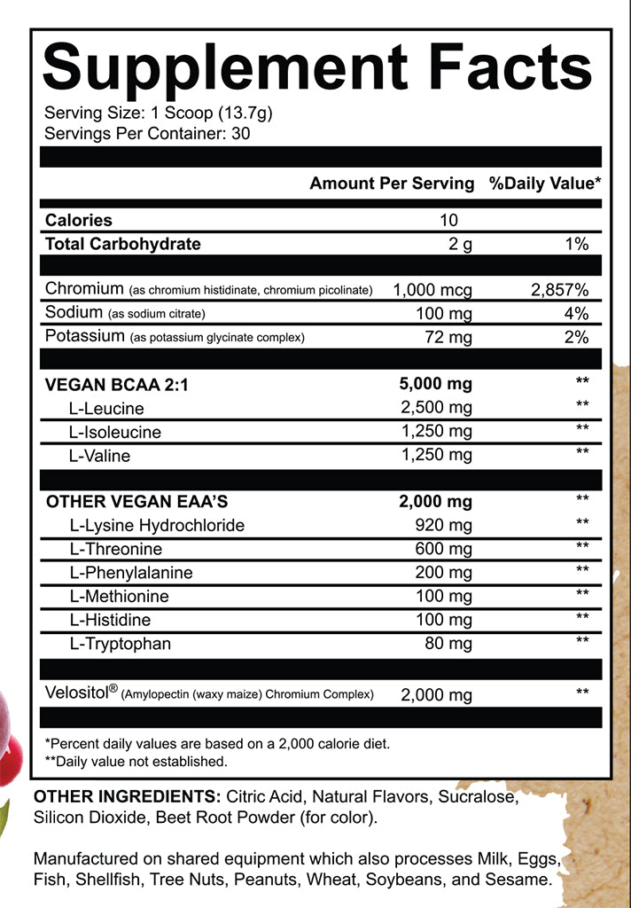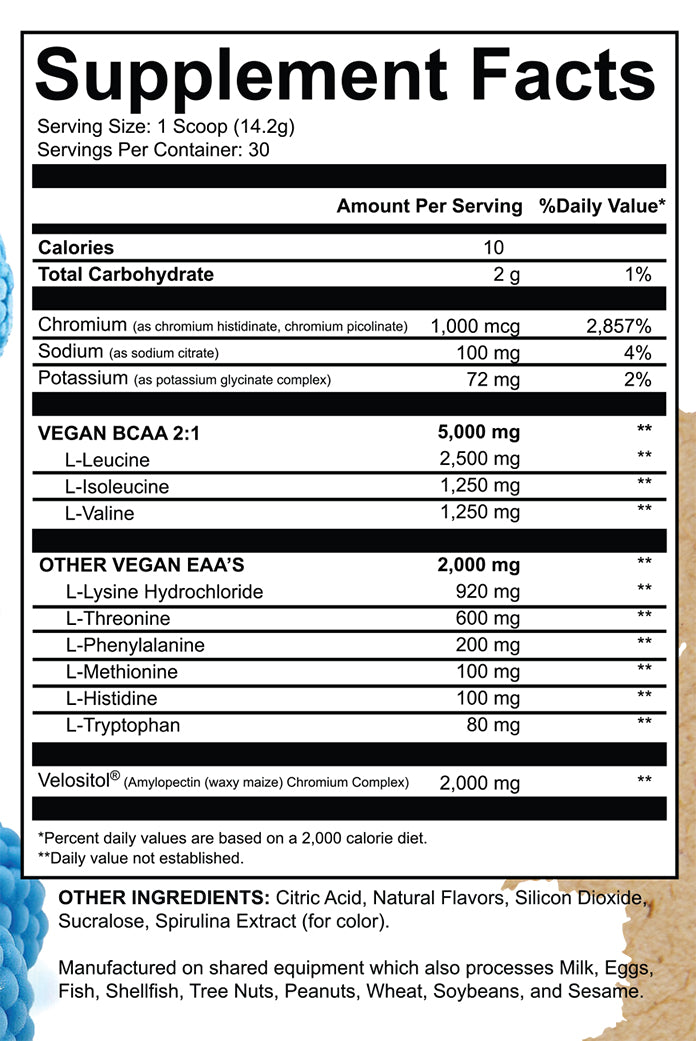 Velositol®, when combined with EAAs has been shown to enhance muscle protein synthesis by up to 2x what EAAs can achieve on their own. As a patented ingredient made of amylopectin and chromium, Velositol® has been shown to increase insulin sensitivity and stimulate amino acid uptake in the muscles, where you want it most. This can result in more efficient recovery, improved muscle growth, and better overall performance.