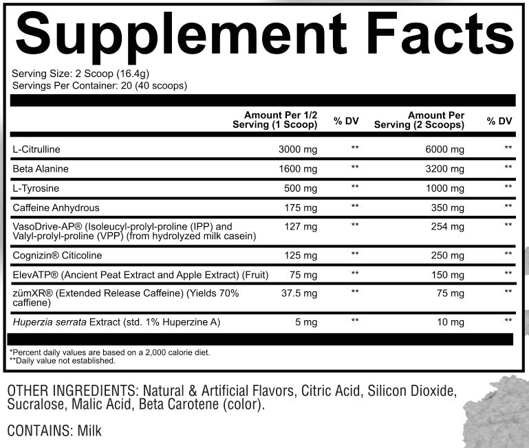• HARNESS (20 servings / 40 scoops): 6g L-citrulline, 3.2g beta-alanine, 254mg VasoDrive-AP®, 250mg Cognizin, 150mg ElevATP®, 75mg ZumXR™ (XR Caffeine).