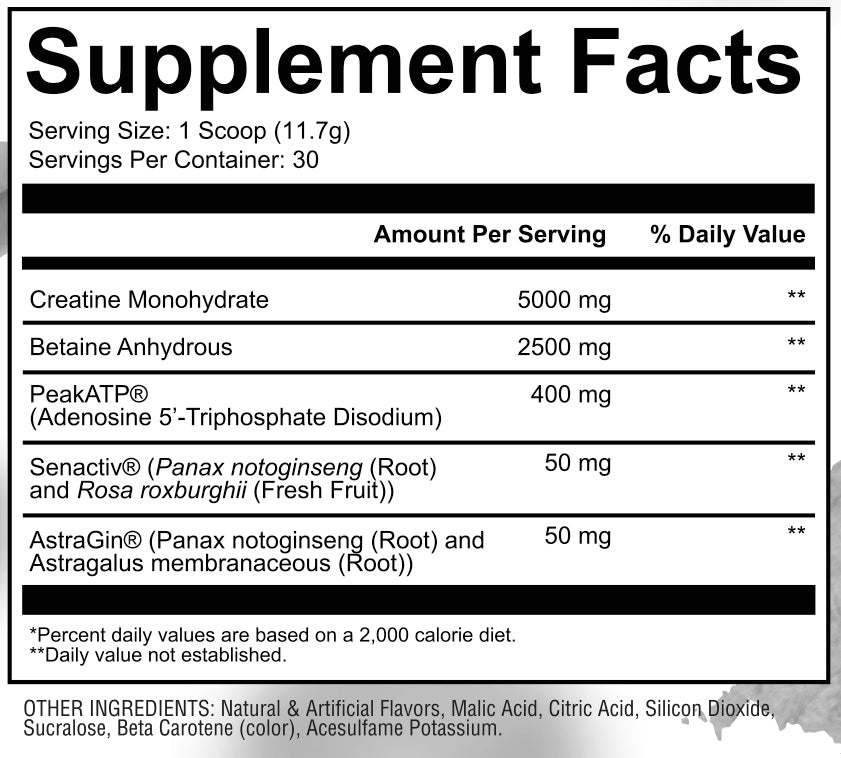 • VIGOR (30 servings): 5g creatine monohydrate, 2.5g betaine anhydrous, 400mg PeakATP®, 50mg Senactiv®, 50mg AstraGin®.