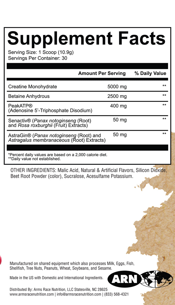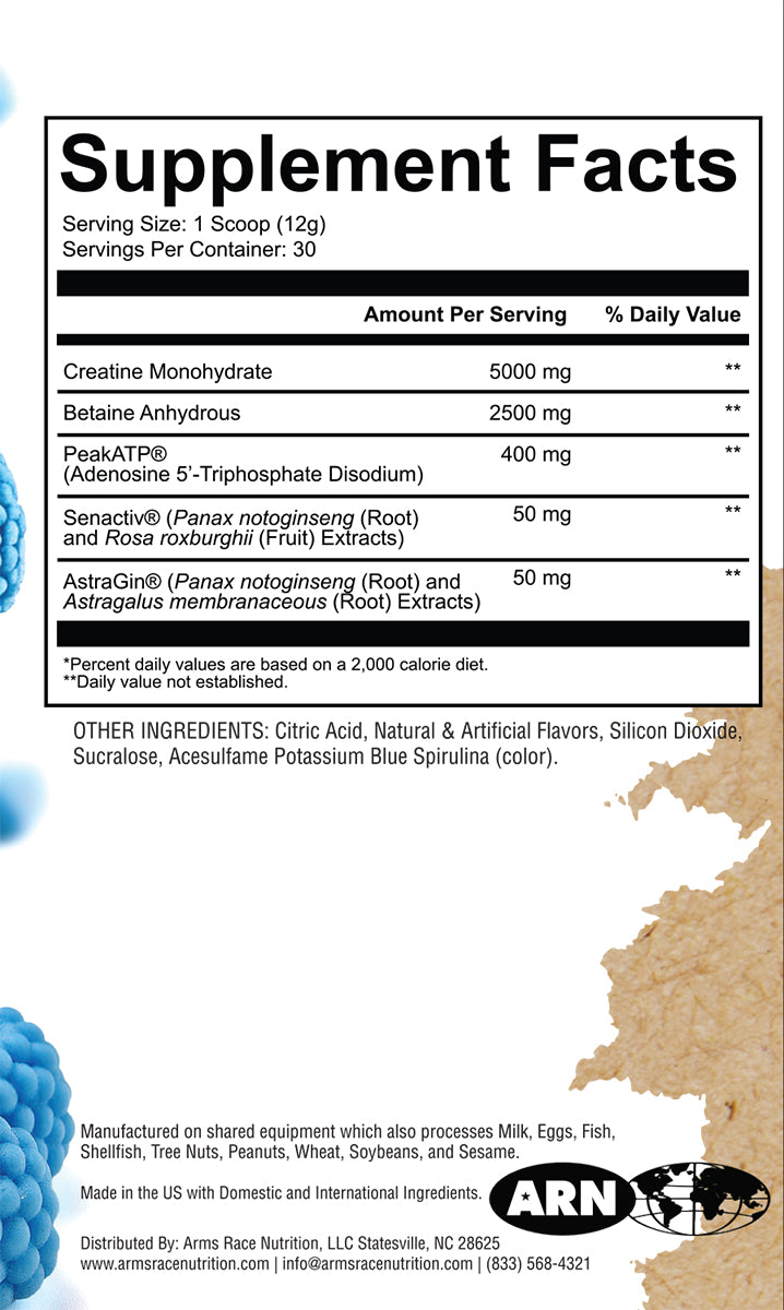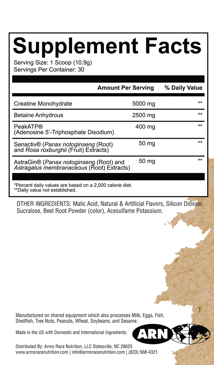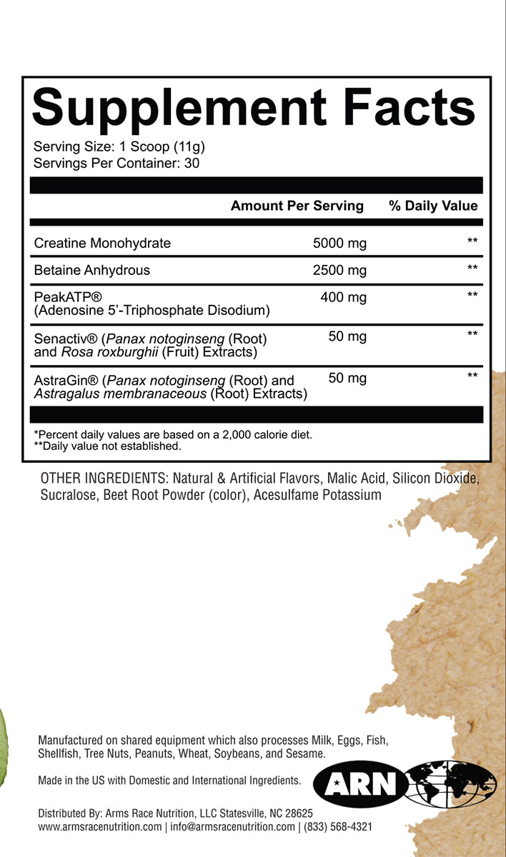 Creatine supports the body’s ATP (energy) production to aid in skeletal muscle contractile force production, increase endurance, and explosive capabilities. Creatine also dilates the vasculature, improves muscle volume, and increases nitrogen retention.